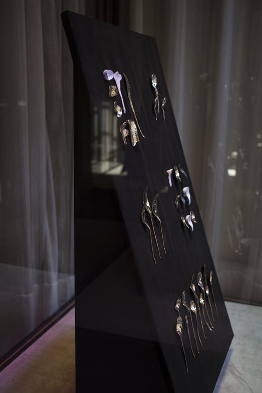 Gamwell uses a sophisticated technical process involving bone china, phosphate dyes, water, and semiprecious metals to create sculptural objects that seductively straddle the line between the fine and applied arts. The result is beautifully disconcerting: fine china and flatware firmly reimagined through the chaotic logic of the natural world.